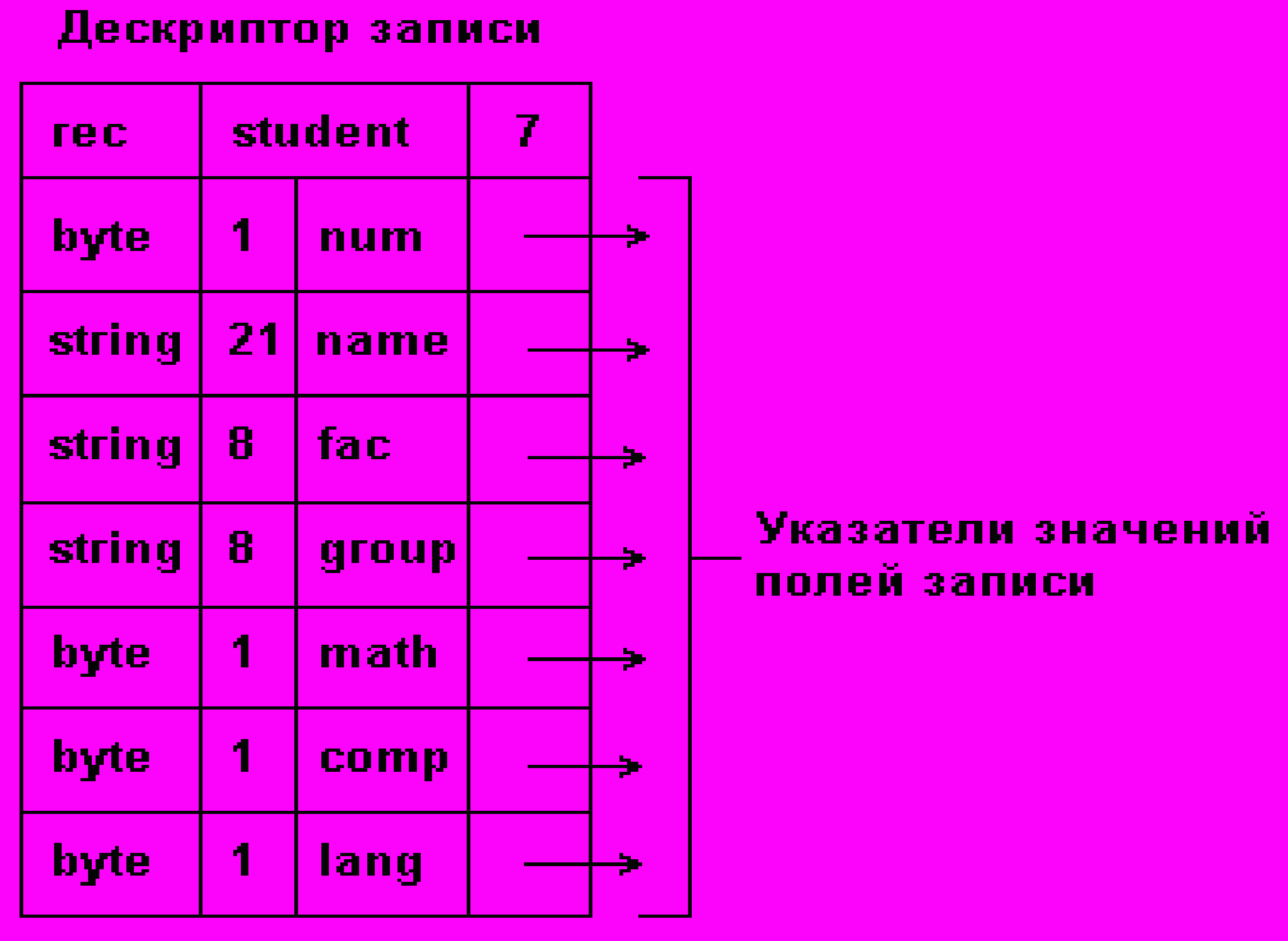 Примечание: для экономии объема памяти, отводимой под запись, значения некоторых ее полей хранятся в самом дескрипторе, вместо указателей, тогда в дескрипторе должны быть записаны соответствующие признаки.