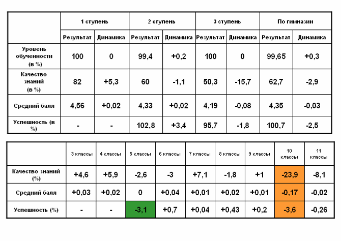 При анализе результатов учебной деятельности должны применяться измерители, позволяющие соотносить колебания качественных показателей по предметам, классам, параллелям и гимназии в целом. В гимназии такие измерители разработаны с использованием базы данных. Были проанализированы результаты учебной деятельности учащихся гимназии за 5 лет по 620 класс-предметам.