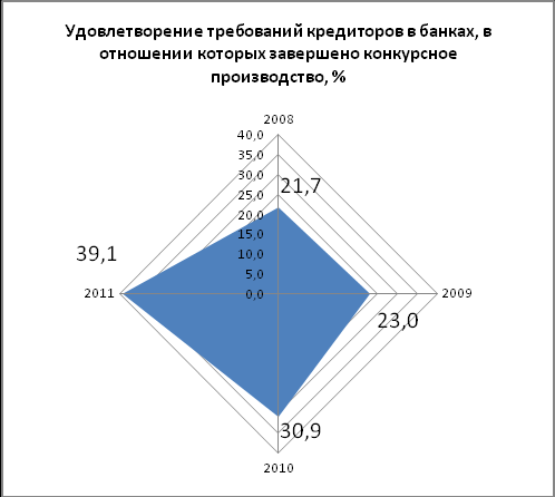 - За год завершены ликвидационные процедуры в 15 кредитных организациях. В 10 банках-банкротах требования кредиторов удовлетворены в среднем на 39,1% (наилучший результат за время работы Агентства в качестве конкурсного управляющего).