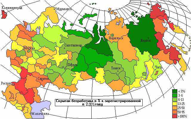 Отчасти это связано с реальными процессами реструктуризации производства или различиями в тактике сохранения кадров, применяемой директорами промышленных и аграрных предприятий. Но, по-видимому, большее значение имеют другие факторы, среди которых выделяются эффективность работы местных служб занятости и срытая безработица. В целом России имеет место весьма существенная скрытая безработица.