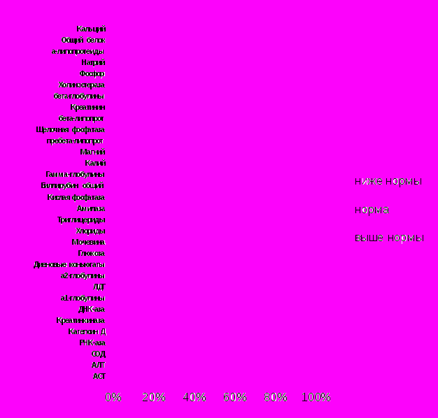 На основе полученных результатов был проведен анализ структуры распределений значений показателей с учетом границ физиологической нормы (рис.2). Установлено, что наиболее стабильными (с коэффициентом не превышающим 15%) оказались концентрации электролитов в сыворотке крови, общего белка, белковых фракций и уровень липопротеидов. Низкая вариабельность показателей характерна также для активности кислой фосфатазы, холинэстеразы и диеновых конъюгатов жирных кислот. С коэффициентом вариации от 15 до 50% установлены изменения в сыворотке крови содержания холестерина, глюкозы, прямого и общего билирубина. Максимальная вариабельность была характерна для активности ферментов, в частности, щелочной фосфатазной активности, лактатдегидрогеназной, АЛТ-азной, креатинкиназной, амилазной, АСТ-азной. Значения коэффициента вариации данных показателей превышали 50%, а по некоторым показателям они составили более 100 и 200%.