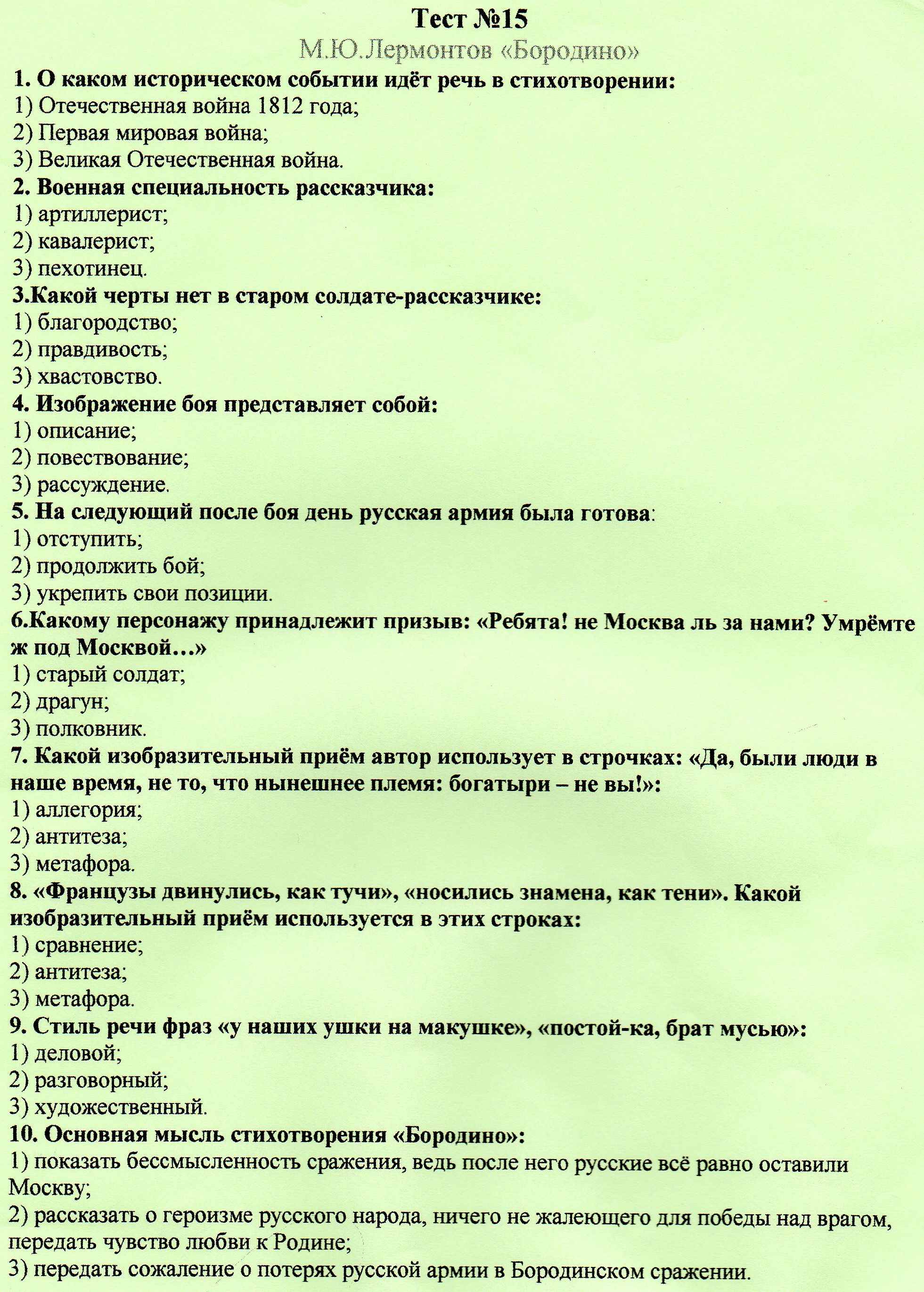 Вывод: Лермонтовский герой говорит от имени целого поколения, пережившего войну 1812 года, от имени всего русского народа, отстоявшего Родину в Бородинском сражении.