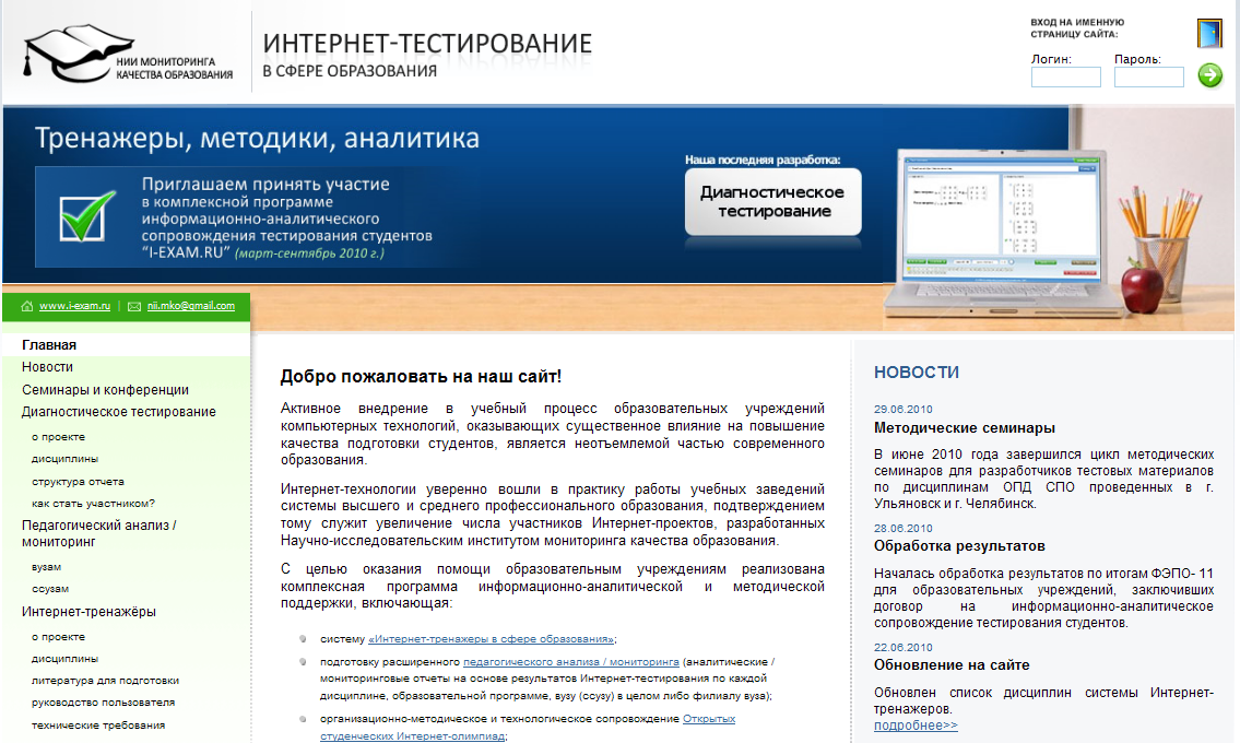 Для ознакомления с технологией использования системы Интернет-тренажеров в свободном доступе на сайте ссылка скрыта в разделе «ИНТЕРНЕТ-ТРЕНАЖЕРЫ» предложены варианты тренажеров по дисциплинам «Математика» цикла ЕН ВПО, «Основы экономики» цикла ГСЭ СПО, а также тестовые материалы для подготовки к диагностическому тестированию студентов-первокурсников по математике, русскому языку, физике, химии, разработанные в соответствии со структурой контрольных измерительных материалов ЕГЭ 2009, ЕГЭ 2010.