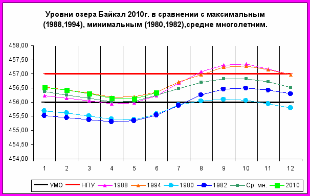 Ниже приводятся график уровней озера Байкал за 2010г. в сравнении с максимальными годами (1988,1994), минимальными (1980,1982) и средне многолетним уровнем воды, а также гистограмма полезного притока в озеро Байкал за 2010 год в сравнении с 2009 годом и среднемноголетним притоком
