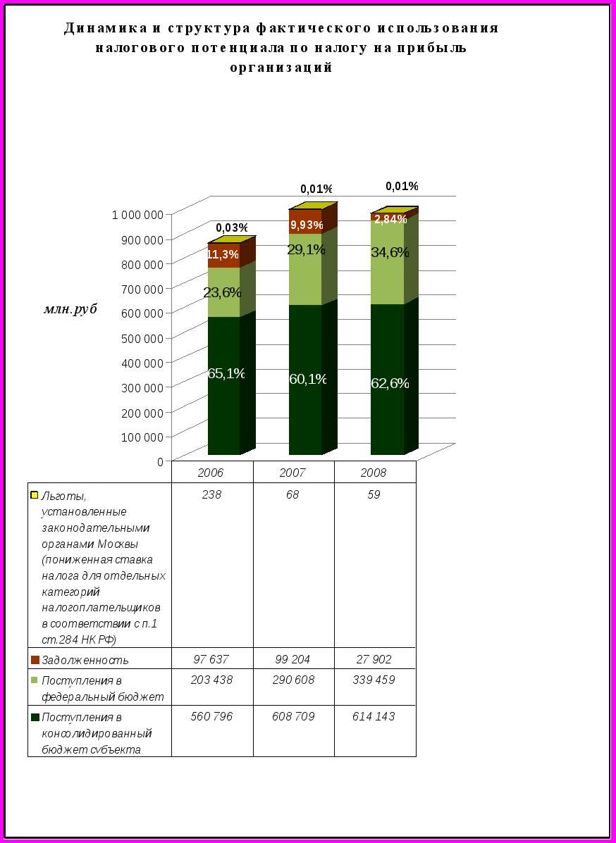 Как и в случае общей оценки налогового потенциала, налог на прибыль невозможно рассматривать вне динамики общей макроэкономической ситуации. За прошедшее после кризиса 1998 года десятилетие развитие города Москвы достигло устойчивого экономического подъема. Валовой региональный продукт увеличивался в среднем на 9,2% в год, промышленное производство - на 15,0%, инвестиции в основной капитал - на 7,6%, оборот розничной торговли - на 4,5%. График «Динамика и структура фактического использования налогового потенциала по налогу на прибыль организаций» (прил. 3) иллюстрирует данные фактического использования налогового потенциала по налогу на прибыль в 2006-2008 гг.