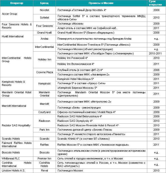 Гостиницы, вводимые в Москве международными управляющими компаниям