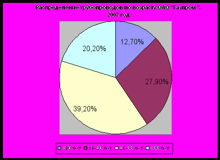 Рис. 7. Распределение трубопроводов ОАО «Газпром» по возрасту в 2007 году