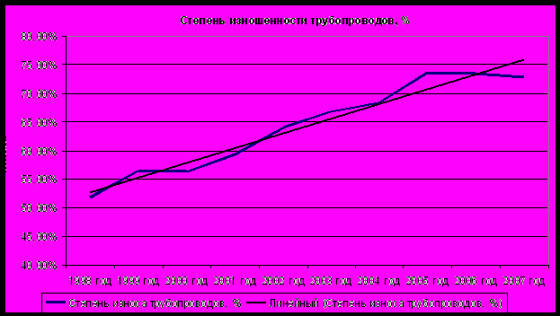 Как видно из графика, за 10 лет изношенности трубопроводов повысилась более чем на 20%. При сохранении текущей динамики через 10 лет изношенность труб достигнет примерно 95%.