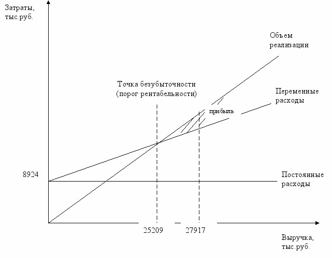 Таким образом, предприятие достигает уровня безубыточности при объеме реализации 25209 тыс.руб., при этом окупаются переменные и постоянные затраты. В 2009 году выручка предприятия составила 27917 тыс. руб., что выше уровня безубыточности на 2708 тыс.руб., или 10,7%.