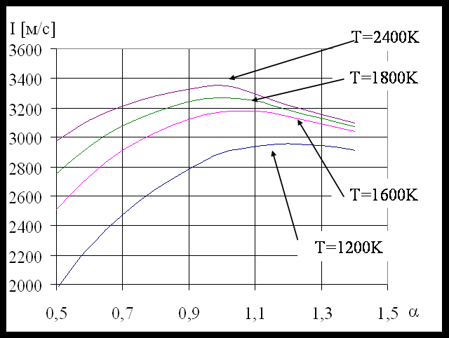 ![]() Рис. 10. Расчетная зависимость удельного импульса двигателя МАИ-202-200 в зависимости от коэффициента избытка окислителя для различной максимальной температуры стенки камеры сгорания (для одно-форсуночной головки). | ![]() Рис. 11. Расчетная зависимость удельного импульса двигателя МАИ-202-500-ВПВК в зависимости от коэффициента избытка окислителя для различной максимальной температуры стенки камеры сгорания. |