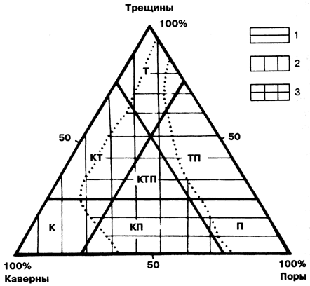 На рис. 60 объединены две треугольные диаграммы, предложенные американским геологом Т. Аткинсоном. Принципы их построения очень просты: основания равностороннего треугольника отвечают 0%, жирные линии - 25%, вершины - 100% количеств данного признака. Так выделяются поля поровых (П), трещинных (Т), каверновых (К), смешанных двойных (ТП, КП, КТ) и тройных (КТП) коллекторов. Штриховка соответствует трем формам движения воды в них: турбулентной (1), ламинарной (2) и смешанной (3). Следовательно, если мы имеем дело с карстом, где в разных соотношениях встречаются К, Т, П, КТ, КП, ТП и КТП-коллекторы, то в нем должны иметь место в основном турбулентное и смешанное движения воды.