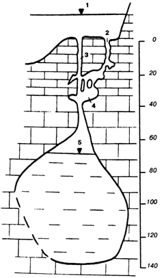 Рис. 68. Разрез пещеры Петек, Турция (по А. Бозовичу).1 - проектный уровень воды в водохранилище; 2 - водовороты возникшие при заполнении водохранилища; 3 - шахта пройденная для заполнения пещеры; 4 - пещера, вскрытая скважинами и шахтой; 5 - уровень воды в пещере