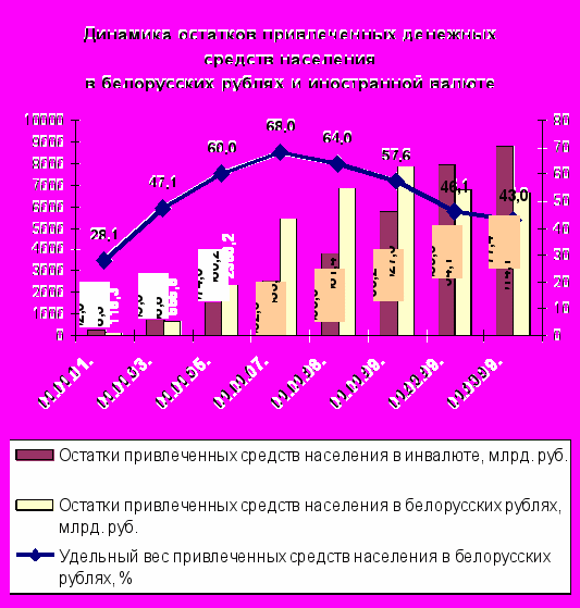 С ноября 2008 г. структура привлеченных средств населения начала меняться в пользу иностранной валюты. В декабре 2008 г. – январе 2009 г. происходил активный «перелив» средств со срочных вкладов в белорусских рублях во вклады в иностранной валюте.