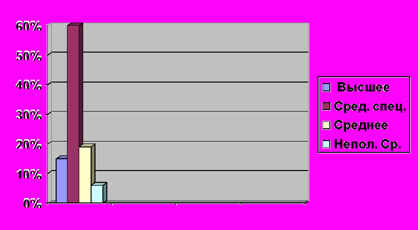Анализ статистики уровня образования родителей показывает, что большая часть – 60% имеет среднее специальное образование, 19 % - среднее, совсем немного уступает процент высшего образования – 15 %. Неполное среднее образование имеют 6 % родителей.