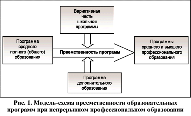 Проект образовательная программа, реализующий непрерывное профессиональное образование учащихся средних школ, обеспечивает преемственность по модели-схеме, которая представлена на рис. 1.