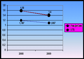 Анализируя доход на рубль вложений в кредитный портфель видно, что данный коэффициент больше в ОАО “Альфа-банк”, притом, что кредитный портфель больше в ОАО “ВТБ” в 4 раза. Просроченная задолженность практически не повлияла на изменение коэффициента в ОАО “ВТБ”. В ОАО “Альфа-банк” коэффициент вырос на 0,05 – 2008 год и на 0, 011 – 2009 год засчёт просроченной задолженности (Рисунок 8).