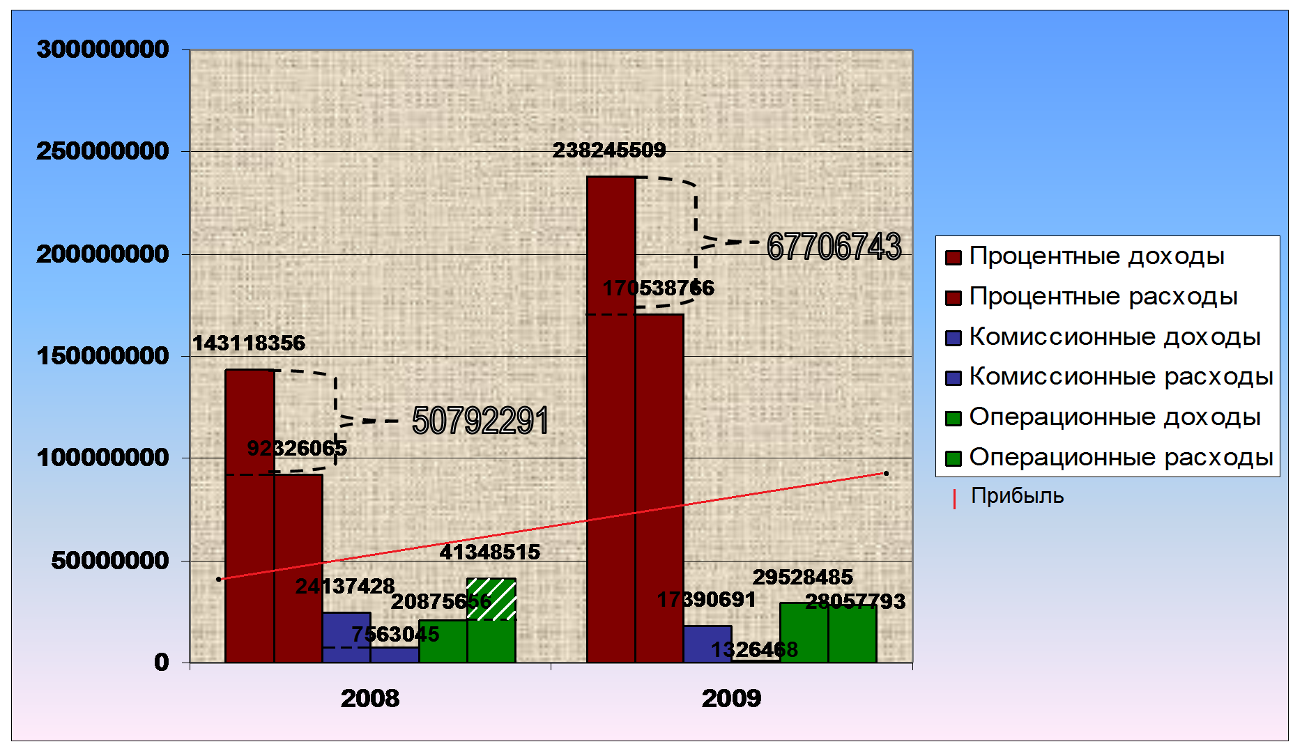В ОАО “ВТБ” процентная маржа выросла на 16 млн. руб., что составляет 34% (с 50 млн. руб. до 67 млн. руб.) (Рисунок 5), при этом валюта баланса ОАО “ВТБ” больше валюты баланса ОАО “Альфа-банк” более чем в 4 раза чистые процентные доходы ОАО “Альфа-банк” составляют около 50% от доходов ОАО “ВТБ” в 2008 году и треть от доходов в 2009 году.