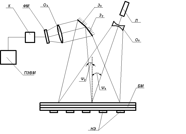 где: Л - гелий-неоновый лазер; О1 - формирующая оптика; БМ - исследуемая поверхность биметалла; З1 и З2 - зеркала Френеля; О2 – объектив; ФМ - фотоприёмная матрица; К - контроллер вывода изображения; НЭ - нагревательные элементы.