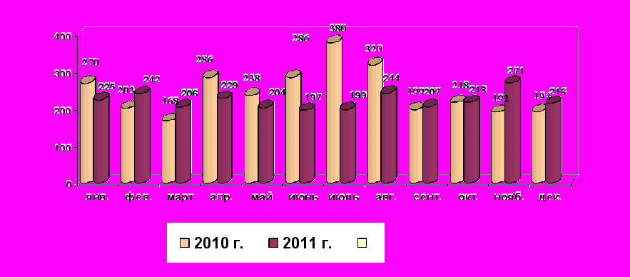 - зарегистрировано 2658 пожаров (в 2010 - 2954, -10,0%);