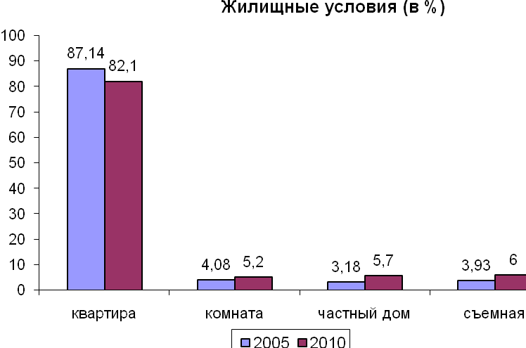 Выводы: Уменьшилось количество семей , проживающих в отдельных благоустроенных квартирах с 87,1% до 82,1%. Увеличилось количество семей, проживающих в комнате, частном доме и на съемных квартирах.