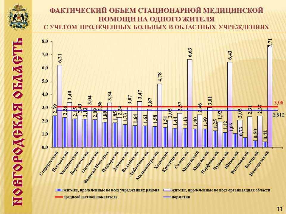 Слайд№11 Фактический объем стационарной медицинской помощи на одного жителя с учетом пролеченных больных в областных учреждениях