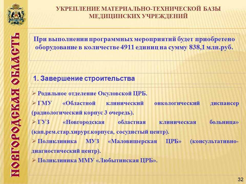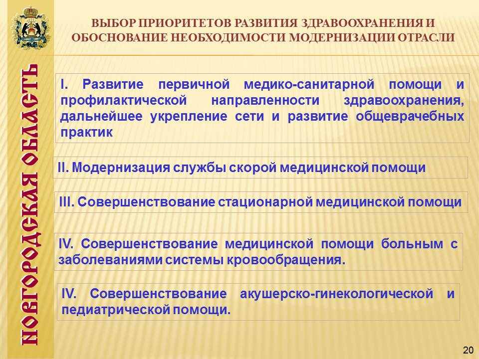 В целях укрепления вертикали управления все городские учреждения здравоохранения Великого Новгорода объединены в единое учреждение здравоохранения, на областной уровень переданы городская инфекционная больница и городской родильный дом №2, на базе которого планируется создание перинатального центра. На базе участковых больниц открываются центры врача общей семейной практики с койками дневного пребывания. Обеспечен единый подход и этапность оказания специализированной медицинской помощи при онкологических, кожно-венерологических, наркологических, инфекционных и психических заболеваниях.