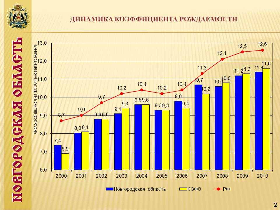 Суммарный коэффициент рождаемости (число детей, рожденных в среднем одной женщиной на протяжении всей ее жизни) составляет на данный момент по Новгородской области 1.379 ребенка (по городской местности – 1.280, по сельской – 1.696). Данный показатель выше среднего по Северо-Западному федеральному округу (1.287) и близок к среднему уровню по России (1,406).