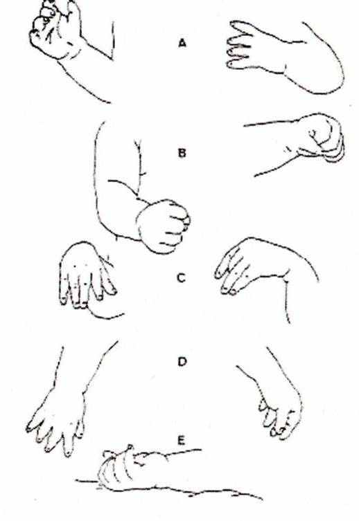 А — состояние появившейся тревоги; В — закрытые кулаки в неприятных ситуациях перенапряжения; С — состояние пассивного бодрствования; D — состояния перехода ко сну; Е — сон.