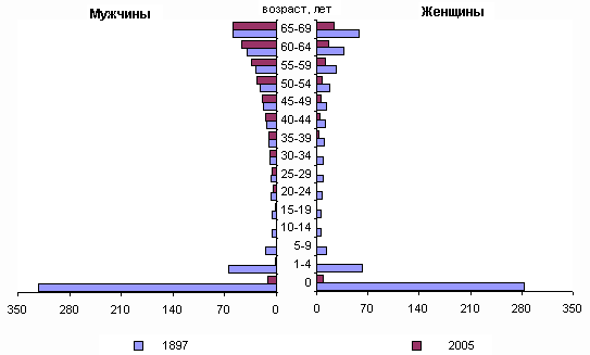 | Возрастно-половая структура населения по переписи 1897 г. и на 1 января 2006 г. | |