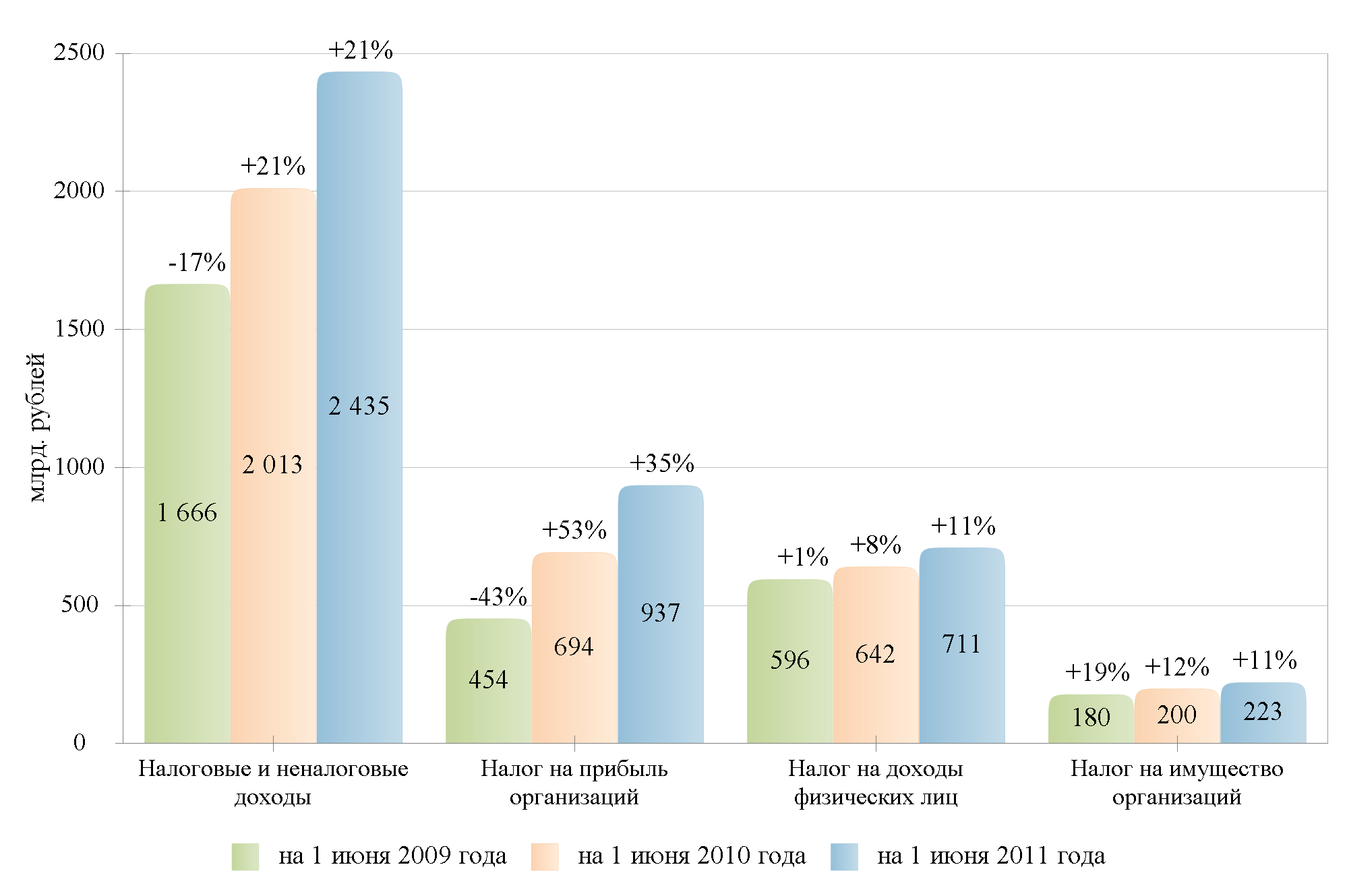- Поступление налога на имущество организаций выросло на 11% (+23 млрд. руб.) относительно уровня 2010 года, составив 223 млрд. руб.