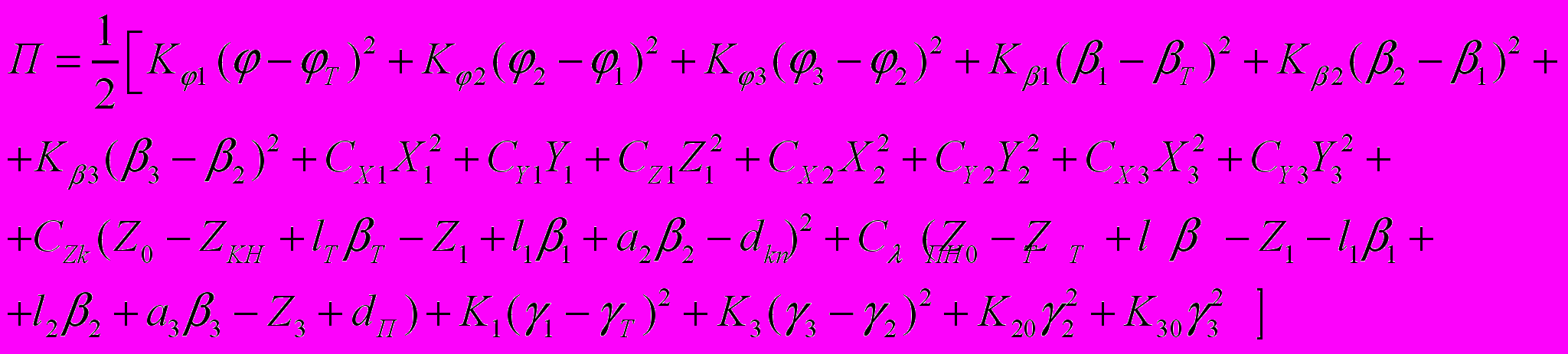 од действием продольных PT, Ppп, Pрл, P2п, P2л, P3п, P3л и поперечных Грп, Грл, Гп, Г2п, Г2л, Г3п, Г3л сил, а также моментов Мт, М1, М2 и М3 массы физической модели совершают пространственные колебания. Относительные деформации масс характеризуются обобщенными координатами φ1, φ2, φ3, Х1, Х2, Х3, Y1, Y2, Y3, Z1, Z2, Z3, β1, β2, β3, γ1, γ2, γ3. Возбуждение колебании осуществляют кинематические координаты φт, Х0, βт, γт, Z0—движения массы трактора и Zкн, Zпн от неровностей микропрофиля дороги под колесами агрегата. Записав абсолютные перемещения расчетной массы подкатной тележки mк и прицепа mп и использовав уравнение Лагранжа второго рода, с учетом сил сопротивления в кинематических парах выведены уравнения энергий