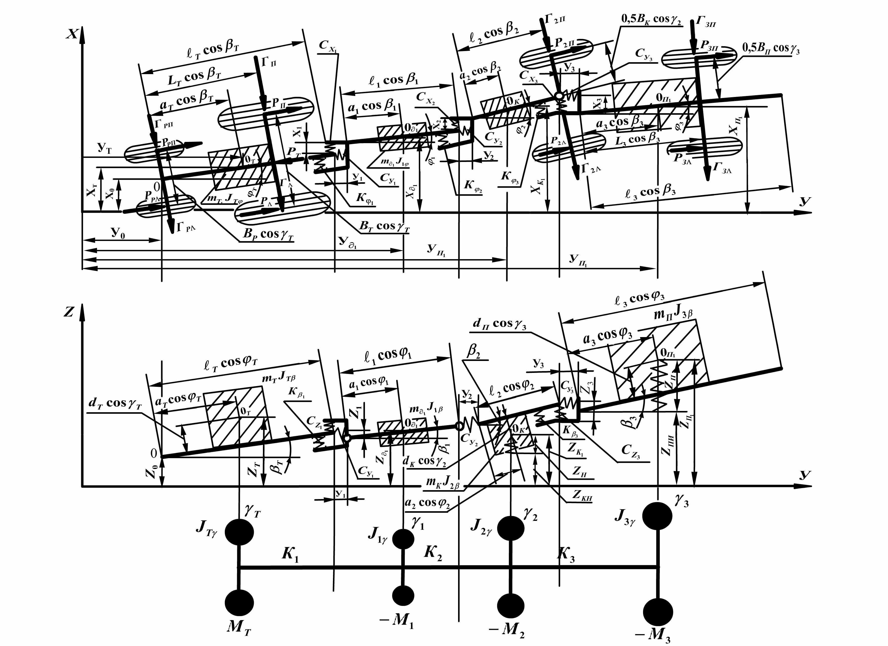 из трактора Т-28Х4М и прицепа 2ПТС-4-793А. На модели поезд представлен в виде четырехмассовой системы с приведенными массами mт, mд, mк и mп (моментами инерции I Tφ, I1φ, I2φ, I3φ, ITβ, I1β, I2β, ITγ, I1γ, I2γ, I3γ,) соединенными между собой упругими связями с постоянными коэффициентами линейной Cx1, Cx2, Cx3, Cy1, Cy2, Cy3, Cz1, Cz2, и Cz3 крутильной Kφ1, Kφ2, Kφ3, Kβ1, Kβ2, Kβ3, K1, K2, и K3 жесткостью, характеризующими место сцепа трактора с дышлом прицепа, дышла с подкатной тележкой и подкатной тележки с его рамой.