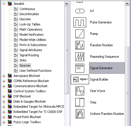 - Какие блоки программы Simulink используются для создания гармонических сигналов, ступенчатых воздействий, прямоугольных и треугольных импульсов.