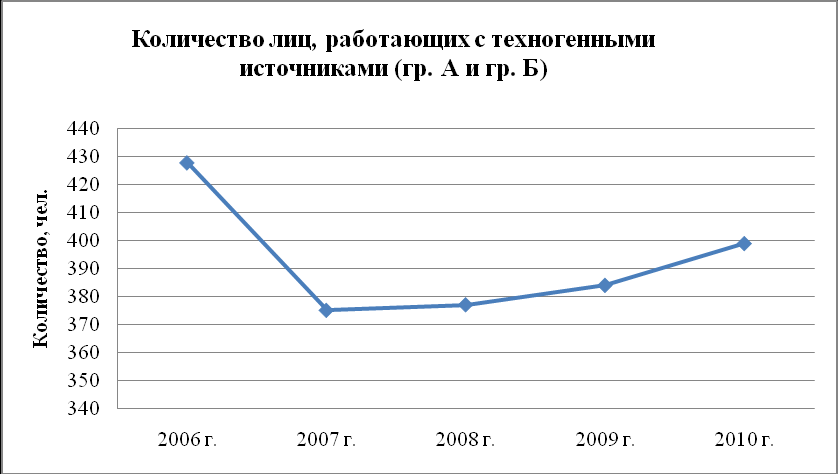 Рис. 3. Количество лиц (гр. А и гр. Б), работающих с техногенными источниками ионизирующих излучений в 2006-2010 г.г.