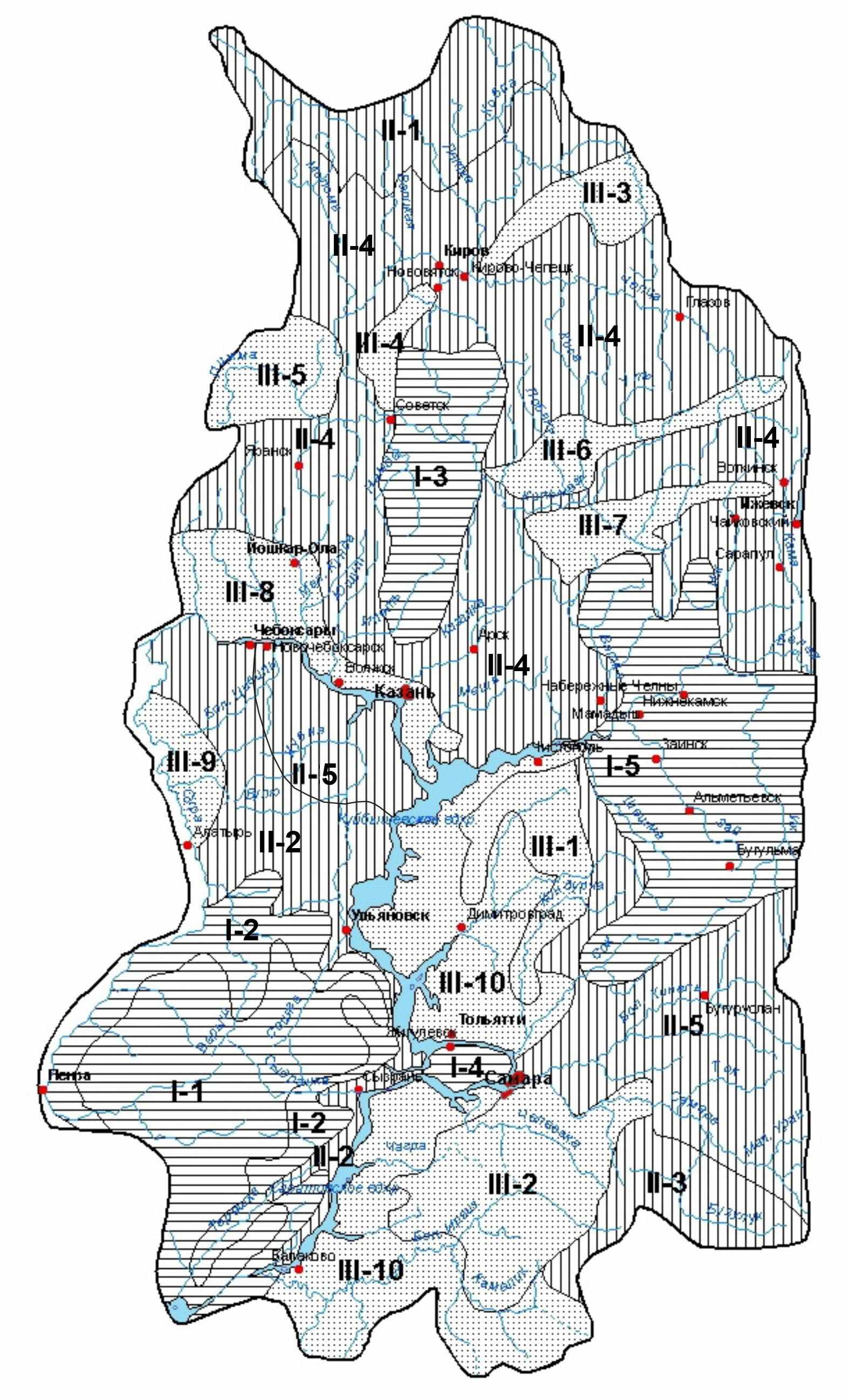 Область включает следующие районы в полосе распространения песчано- глинистых пород верхней юры и нижнего мела: Верхневятский (II-1), Свияго- Сурский (II-2), Бузулукский (II-3); в зоне развития глинисто-карбонатных отложений перми-нижнего триаса: Вятско- Камский (II-4) и Свияго- Кинельский (II-5).