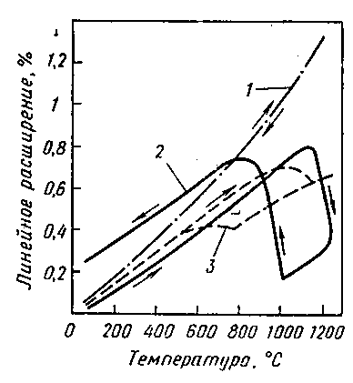 1 – кубического стабилизированного; 2 – моноклинного нестабилизированного; 3 – частично стабилизированного (стрелками отмечено направление процесса нагревания и охлаждения).