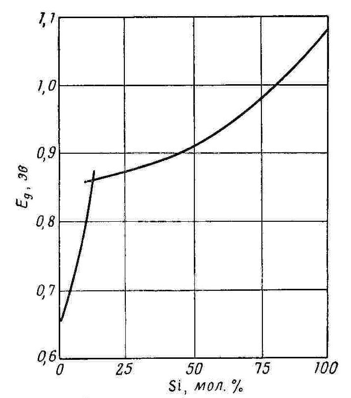 Рис. 6.1. Зависимость ширины запрещённой зоны от состава сплава германий – кремний.