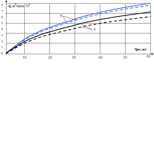 Рис.9. Зависимости производительности шлифования стекла К8(1) и ситалла СО115м(2) от скорости резания Vрез