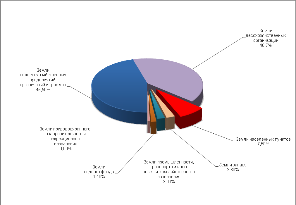Распределение земельного фонда по угодьям выглядит следующим образом: сельскохозяйственные угодья занимают 3130,7 тысяч га; земли под поверхностными водами – 161,7 тысяч га; болота – 119,6 тысяч га; земли под лесами и древесно – кустарниковой растительностью – 3 892,6 тысяч га; другие угодья – 357,8 тысяч га.