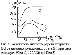 Давление реакционного газа непосредственное влияние оказывает и на микротвердость однослойных покрытий типа MNx и MC в процессе их формирования. Из Рис.7 видно, что с увеличением давления реакционного газа, микротвердость покрытий возрастает, так как поступление большего объема реактивного газа способствует более полному протеканию плазмохимических реакций. Но при дальнейшем увеличении давления микротвердость покрытия снижается, что обусловлено образованием покрытий, имеющих в своем составе повышенную концентрацию химических элементов реакционного газа, приводящих к дефектности структуры и снижению микротвердости [6].