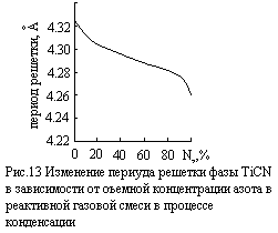 Как и для однослойных покрытий, свойства многослойных покрытий непосредственно зависят от технологических особенностей процесса их нанесения на рабочую поверхность режущего инструмента. Выше сказанное можно проиллюстрировать на примере покрытия TiCN, наносимого методом РИБ. Период решетки данного покрытия зависит от соотношения между количеством азота и углеводородной смеси в реакционном газе. Из рис.13 видно, что период решетки максимален и равен 4.325 Å, когда реактивный газ содержит только углеводородную смесь, и минимальный период – 4.261 Å, когда реактивный газ содержит только азот [2].