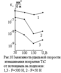 В (1), ∆V есть приращение объемного износа покрытия на пути трения ∆L, а F- нагрузка. В [9] установлена зависимость удельной скорости изнашевания от потенциала на подложке (рис.10). Из рисунка видно, что при напряжении 150 В величина К имеет минимум. Это, по-видимому, определяется плотностью покрытия и его адгезионной прочностью.