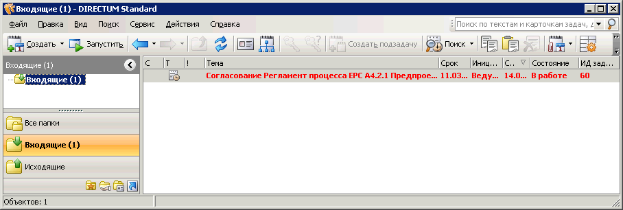 После старта задачи пользователи, назначенные в качестве рецензентов, получают задания согласовать необходимый документ. Задания с истекшим сроком выполнения в папке «Входящие» помечаются красным цветом (Рис. 10).
