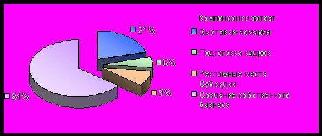 Сумма компенсации части затрат на участие в выставочно-ярмарочной деятельности возросла в 2010 году по сравнению с 2009 годом в 2,7 раза (в 2009 году: 8 – 256,7 тыс. рублей, в 2010 году: 20 – 707,1 тыс. рублей). За счет привлеченных средств предельные объемы компенсации увеличены от 50,0 тыс. рублей до 100,0 тыс. рублей на одно обращение, что содействует продвижению товаров и услуг местных производителей, стимулирует СМСП к участию в региональных, межрегиональных, международных конференциях, семинарах, конкурсах, выставках с целью развития и повышения их статуса.