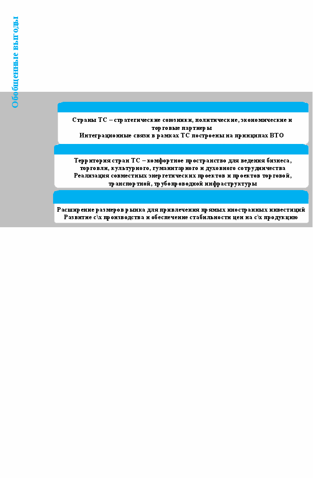 Участие Республики в Таможенном Союзе это не только беспошлинное передвижение товаров (хотя этот факт является основополагающим). Это - единое транспортное, образовательное и культурное пространство; это – свобода передвижения капитала, услуг, рабочей силы; это - создание условий для стабильного развития экономики Сторон в интересах повышения жизненного уровня населения стран сообщества.