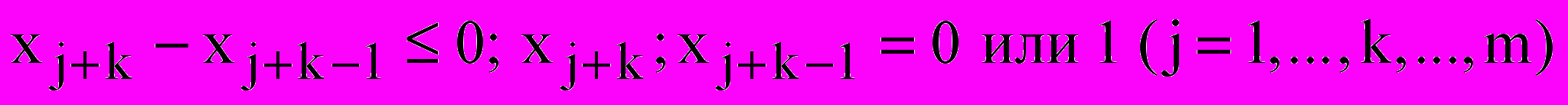 Неравенство (5) означает, что проекты xj+k и xj+k+1 являются взаимоисключающими, т.е. если xj+k = 1, то xj+k+1 должен быть равен 0, и наоборот. Неравенство (6) учитывает фактор взаимной зависимости проектов. Проект xj+k нельзя включить в программу, не сделав этого предварительно в отношении проекта xj+k+1.
