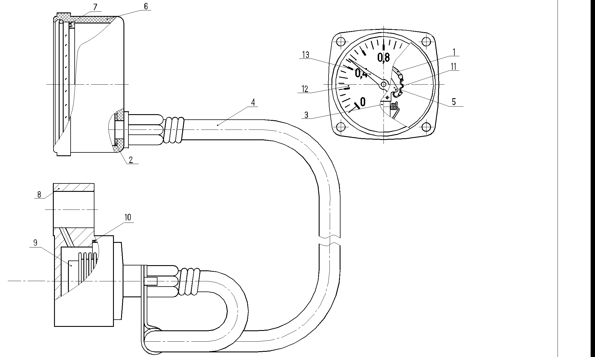 3.3 Один конец манометрической пружины жестко закреплен в держателе (3). Второй конец свободен и тягой (11) соединен с трибко-секторным механизмом. На ось трибки трибко-секторного механизма насажена показывающая стрелка (13). Показания манометров снимаются по шкале циферблата (12).