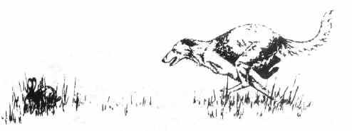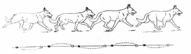 КЕНТЕР (THE CANTER) - это вид аллюра, более медленный и не такой утомительный, как галоп, с тремя ударами в каждом шаге, при котором две ноги по диагонали ставятся на землю одновременно, а две другие в разное время. Когда собака "ведет" передней левой ногой (как на этом рисунке), передняя правая нога поднимается и опускается синхронно с левой задней ногой. Кентер иногда называют "сдержанным галопом" или "бегом вприпрыжку", но эти термины говорят скорее о скорости движения, чем о порядке перестановки ног, а именно последнее является отличительной чертой кентера.