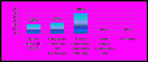 Так как Иркутск имеет свою театральную историю, то соответственно посещение театров, концертных залов, а так же иркутского цирка считают обязательным для себя чуть менее 50% приезжих. Залы для переговоров и конференций использовались почти таким же количеством гостей (165 человек). Фитнес залы и бассейны посещают только истинные приверженцы здорового образа жизни, а их 37 человек из 400 опрошенных.