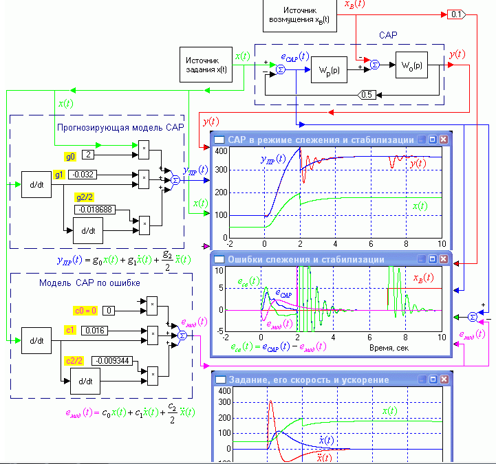 Переходные процессы обусловлены собственными внутренними инерционно-колебательными свойствами САР, которые проявляются при достаточно резком изменении воздействий на нее. Как видно, в районе нуля по времени задание меняется не только непрерывно, но и плавно, тем не менее, переходный процесс, пусть и сравнительно небольшой величины возникает ввиду импульсного изменения скорости и ускорения изменения задания. Прогнозирующая модель САР дает принужденную компоненту выходного сигнала САР, моделирует только установившийся режим работы (синяя линия на верхней осциллограмме в установившемся режиме покрывает красную). Разность выходного сигнала САР и выходного сигнала ее прогнозирующей модели дает свободную компоненту выходного сигнала, определяемую резкими изменениями воздействия (отслеживаемой величины или возмущения). Там, где салатная линия на второй осциллограмме покрывает синюю ошибки прогнозирующей модели нулевые